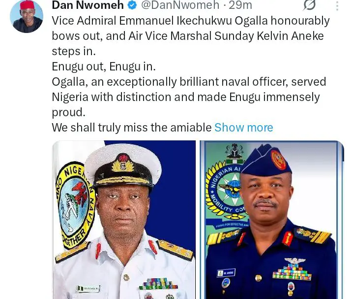 “Vice Admiral Emmanuel Ikechukwu Ogalla honourably bows out, and Air Vice Marshal Sunday Kelvin Aneke steps in. Enugu out, Enugu in. Ogalla, an exceptionally brilliant naval officer, served Nigeria with distinction and made Enugu immensely proud. We shall truly miss the amiable Admiral.”