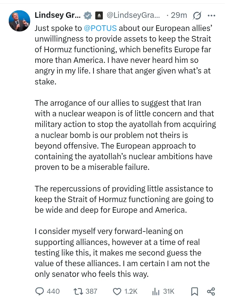 The senator warned that the consequences of limited cooperation could be severe, not only for Europe but also for the United States, as disruptions in the Strait of Hormuz could impact global oil markets and economic stability.