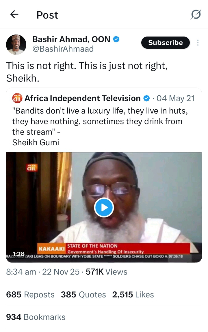 In a post on X (formerly Twitter), Ahmad quoted Gumi’s 2021 remark: “Bandits don’t live a luxury life, they live in huts, they have nothing, sometimes they drink from the stream.” Ahmad’s response was direct and unequivocal: “This is not right. This is just not right, Sheikh.” He reacted.