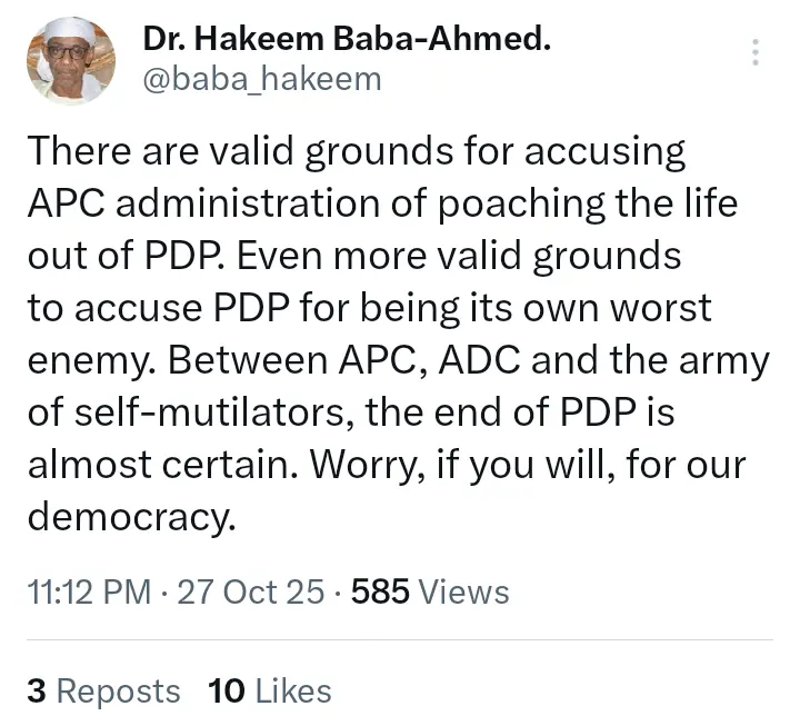 The statement of Hakeem Baba-Ahmed was contained in a post that he shared on his official X handle on October 27, 2025.