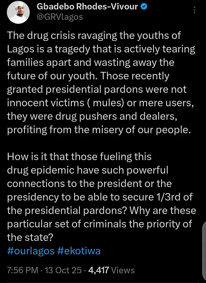 The former governorship candidate in Lagos state, Gbadebo Rhodes-Vivour has taken to his official X account on Monday, October 13, 2025 to react to the presidential pardons that President Bola Ahmed Tinubu granted to some convicts.