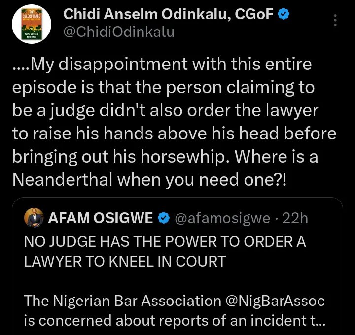 Nigerian lawyer and human rights activist, Prof Chidi Odinkalu, has reacted to a statement by the President of the Nigerian Bar Association (NBA), Afam Osigwe, regarding courtroom conduct.