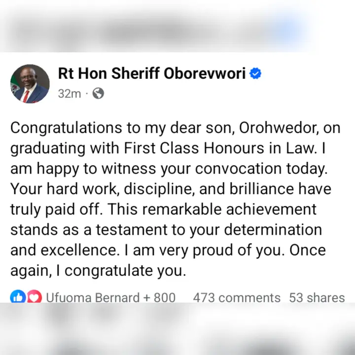 The executive Governor of Delta State and chieftain of the All Progressives Congress, Sheriff Oborevwori stated on his verified Facebook page on Tuesday; “Congratulations to my dear son, Orohwedor, on graduating with First Class Honours in Law. I am happy to witness your convocation today.”