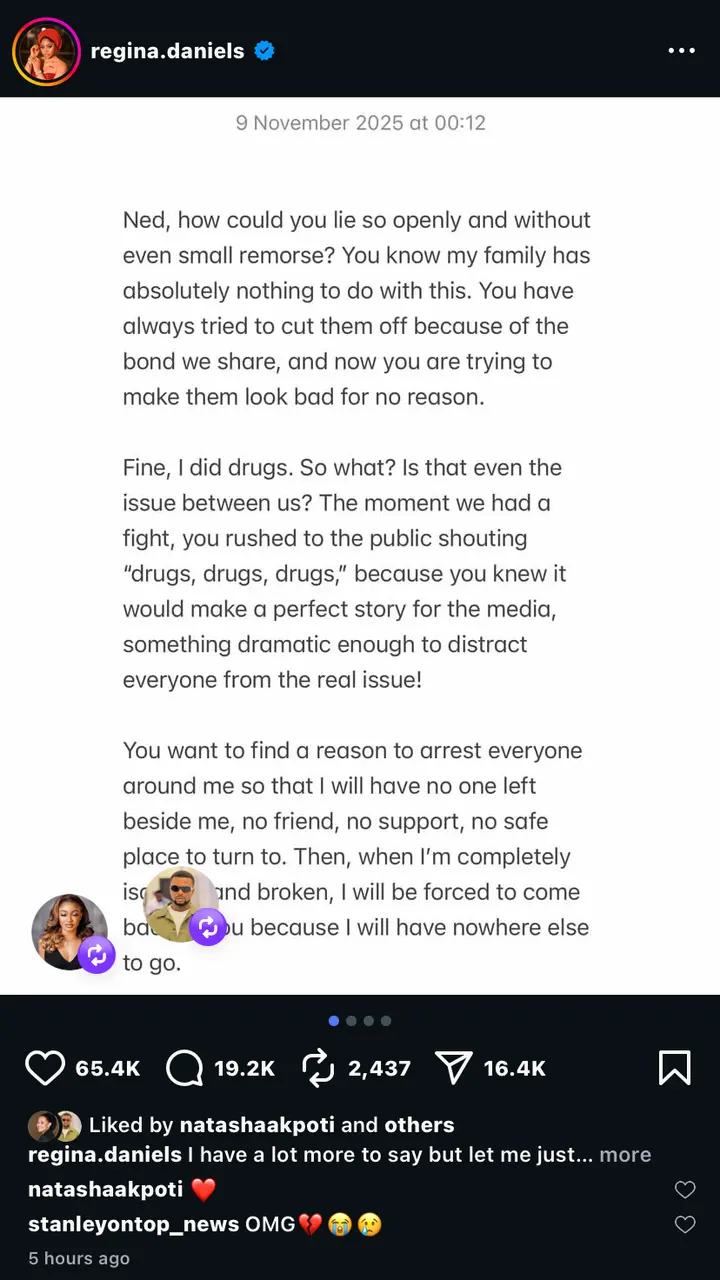 According to a post on Regina Daniels Instagram page on Sunday, November 9, 2025, popular Nollywood actress Regina Daniels has sparked controversy after releasing a four-page document in which she accused her estranged husband, businessman and politician Ned Nwoko, of lies, manipulation, and emotional abuse. In the document shared at midnight, Daniels confronted Nwoko, alleging that he fabricated claims about her drug use to tarnish her family’s image and divert attention from deeper issues in their relationship.