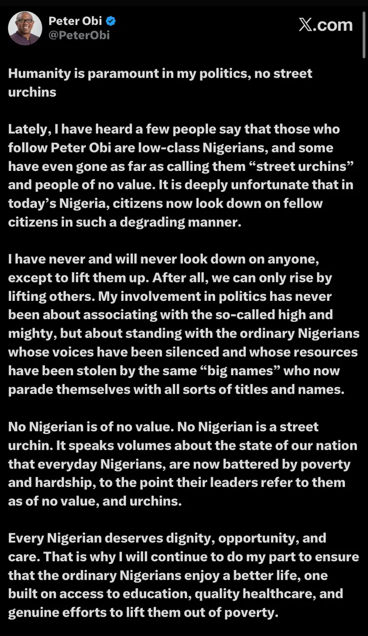 Former presidential candidate of the Labour Party, Mr. Peter Obi, has condemned derogatory remarks describing his supporters as “street urchins” or “people of no value,” insisting that every Nigerian deserves dignity and respect.