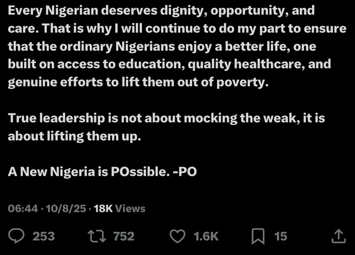 In a post shared on his official X handle on Wednesday, October 8, 2025, Obi emphasized that his brand of politics is rooted in humanity, compassion, and inclusivity, not elitism or class division.