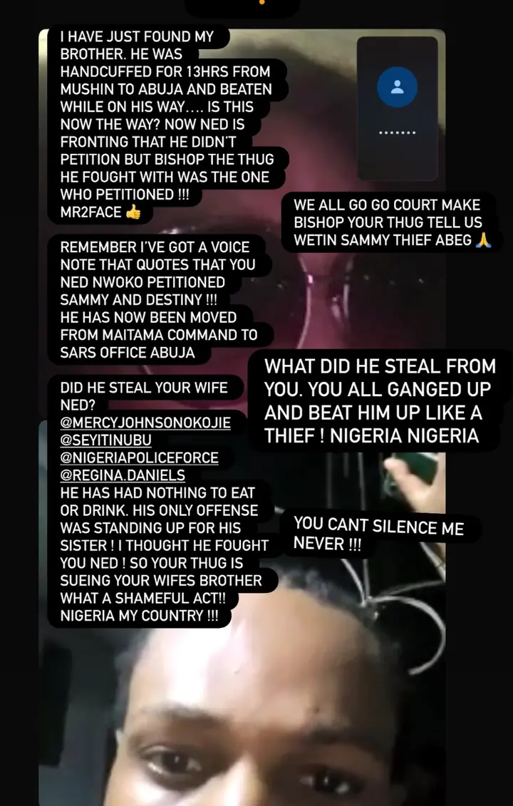 He wrote; “I HAVE JUST FOUND MY BROTHER. HE WAS HANDCUFFED FOR 13HRS FROM MUSHIN TO ABUJA AND BEATEN WHILE ON HIS WAY…. IS THIS NOW THE WAY? NOW NED IS FRONTING THAT HE DIDN’T PETITION BUT BISHOP THE THUG HE FOUGHT WITH WAS THE ONE WHO PETITIONED MR2FACE. REMEMBER I’VE GOT A VOICE NOTE THAT QUOTES THAT YOU NED NWOKO PETITIONED SAMMY AND DESTINY !!! HE HAS NOW BEEN MOVED FROM MAITAMA COMMAND TO SARS OFFICE ABUJA. DID HE STEAL YOUR WIFE NED? HE HAS HAD NOTHING TO EAT OR DRINK. HIS ONLY OFFENSE WAS STANDING UP FOR HIS SISTER ! | THOUGHT HE FOUGHT YOU NED ! SO YOUR THUG IS SUEING YOUR WIFES BROTHER WHAT A SHAMEFUL ACT!!” View, More,