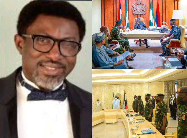 In the photos that Paul Ibe shared on his official X account, President Bola Ahmed Tinubu was sitting with the service chiefs while the former President of Nigeria was standing with the service chiefs.