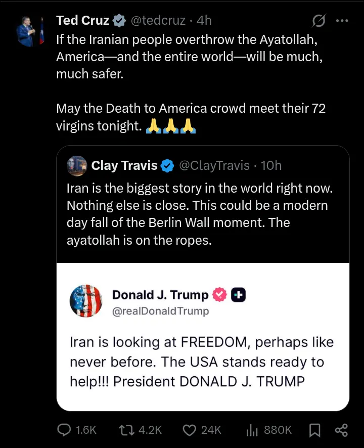However, Cruz’s rhetoric has also sparked debate in Washington and online. Critics argue that inflammatory language risks escalating tensions and undermining diplomatic efforts, while supporters contend that strong statements are necessary to confront what they see as a regime that sponsors regional militancy and suppresses its own people. See More