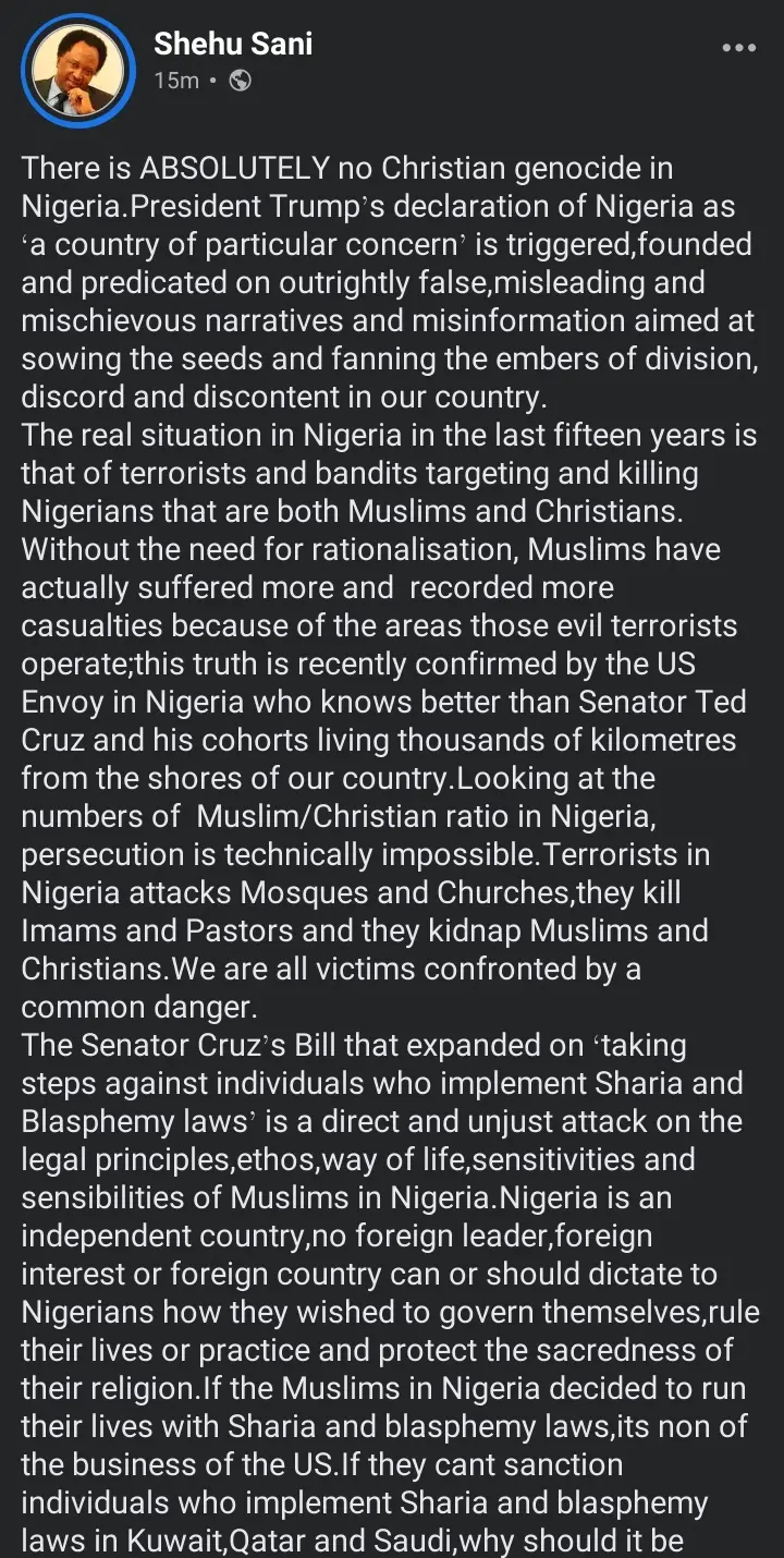 Shehu Sani also condemned a U.S. legislative measure led by Senator Ted Cruz that seeks to impose sanctions on individuals enforcing Sharia and blasphemy laws in Nigeria. He described the bill as a direct and unjust attack on the legal framework, cultural values, and religious sensitivities of Nigerian Muslims.