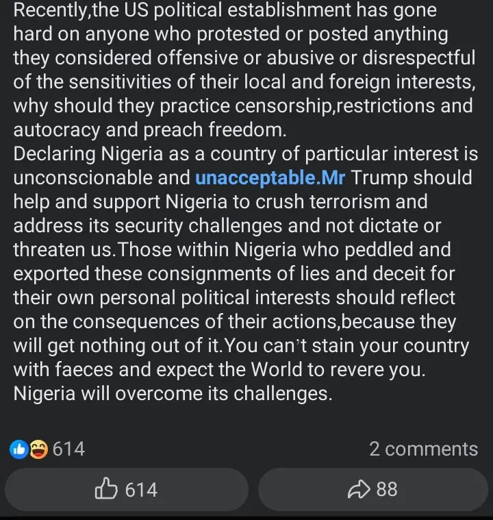 The senator criticized the U.S. for relying on incomplete or politically motivated narratives and urged that international attention should focus on Nigeria’s real security challenges rather than stoking religious tensions.