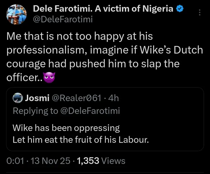In a post on his official X handle, Farotimi sarcastically criticized Wike for maintaining professionalism during the encounter. He hinted that the situation could have turned much more dramatic if Wike had acted on impulse, noting the restraint shown in the face of provocation.