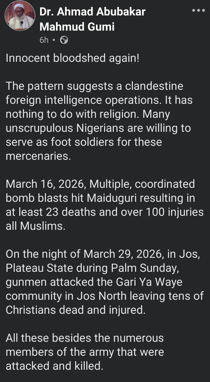 Islamic cleric Sheikh Ahmad Gumi has alleged that recent deadly attacks in Maiduguri and Jos may be linked to clandestine foreign intelligence operations rather than religious divisions.
