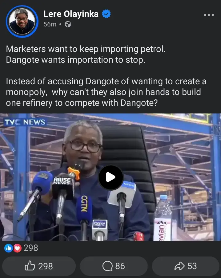 In a post shared on Facebook, Olayinka dismissed claims that Dangote was attempting to create a monopoly in the fuel market. He argued that marketers who are opposed to Dangote’s push to reduce petrol importation should consider building their own refining capacity instead of relying solely on imported products.