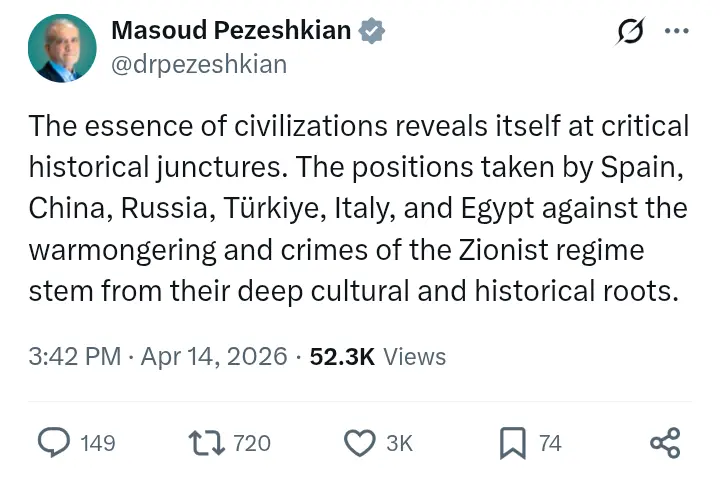 In a statement posted on his verified social media account, Pezeshkian said that “the essence of civilizations reveals itself at critical historical junctures,” pointing to the position of countries such as Spain, China, Russia, Türkiye, Italy, and Egypt.