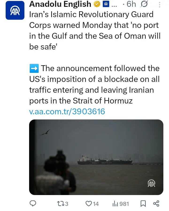 According to a report made by Anadolu English on Monday, 13 April, 2026, Iran’s Islamic Revolutionary Guard Corps in a statement carried by state broadcaster IRIB, declared that the security of ports in the Gulf and the Sea of Oman is either for everyone or for no one, suggesting that Iran considers the US blockade an act of war and may respond by targeting not only American vessels, but also commercial shipping and port facilities allied with Washington across the region.