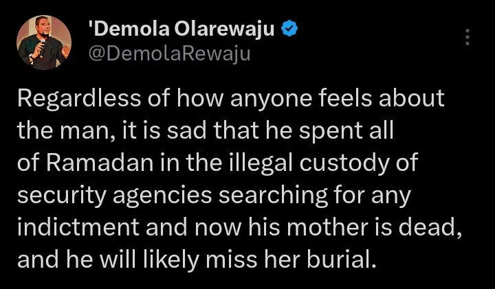 Reacting, Demola Olanrewaju said it is sad that the former governor of Kaduna state has been in detention for a long time. He said as it stands, Mallam Nasir El-Rufai may likely miss the burial ceremony of his mother who has just passed away.