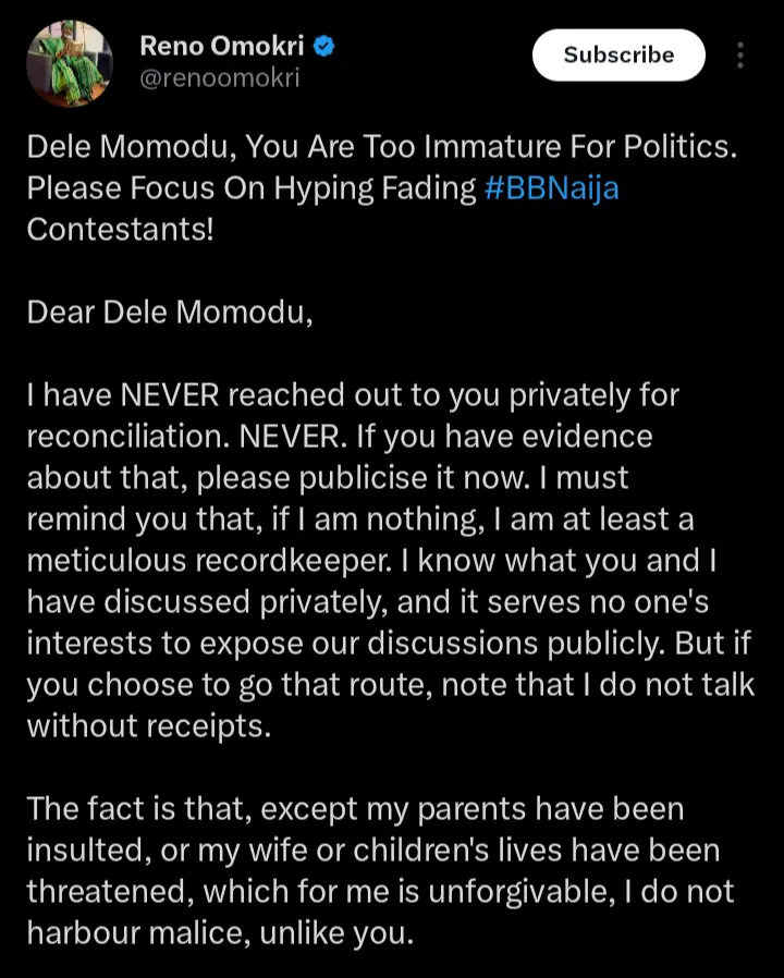 Reno Omokri, a former presidential aide and Nigeria’s ambassador designate to Mexico has dismissed the comments from Elderstateman, Dele Momodu that he was privately approached for reconciliation. According to the statements which were shared on his official X handle, he pointed out that he had never approached him privately.