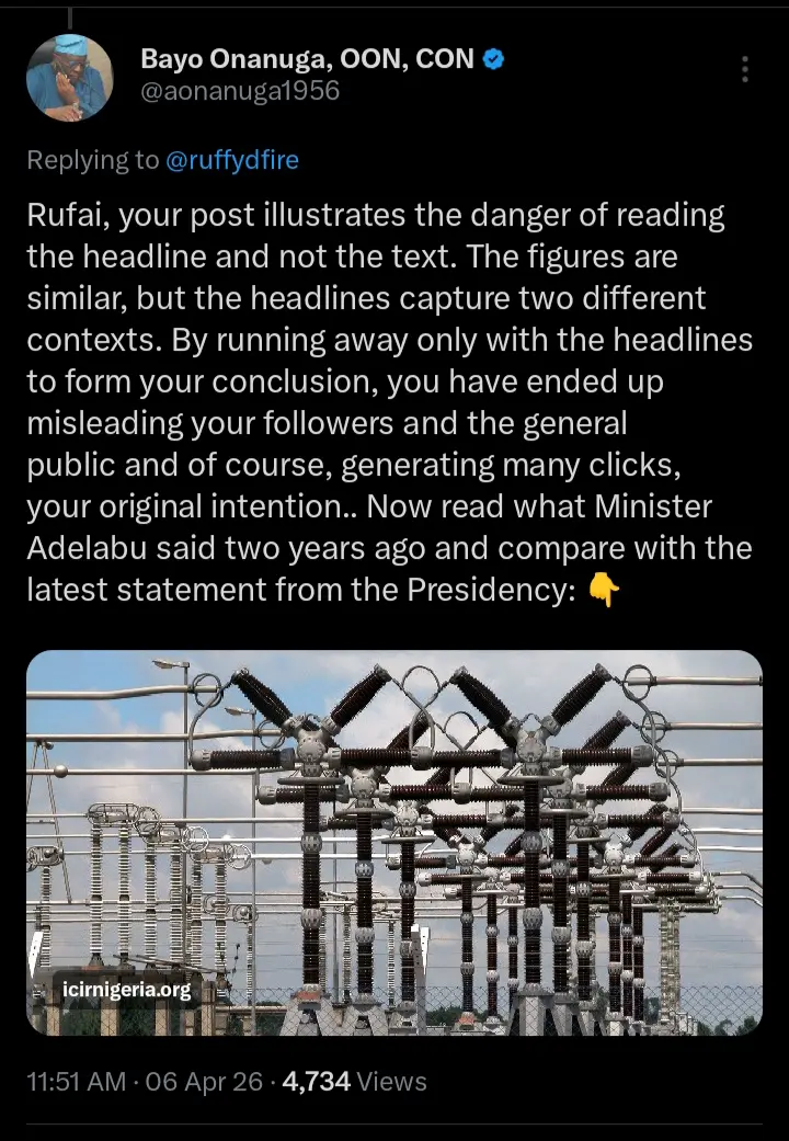 “Rufai, your post illustrates the danger of reading the headline and not the text. The figures are similar, but the headlines capture two different contexts….” Bayo Onanuga wrote. Read_More…