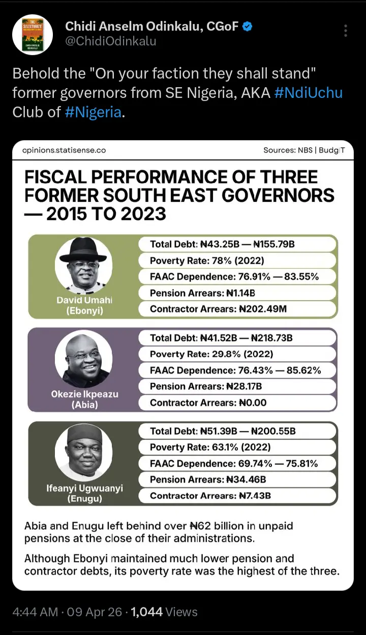 The news regarding the fiscal performances of three well known former governors from the southeast region generated mixed reactions after the reports went viral across various social media platforms.