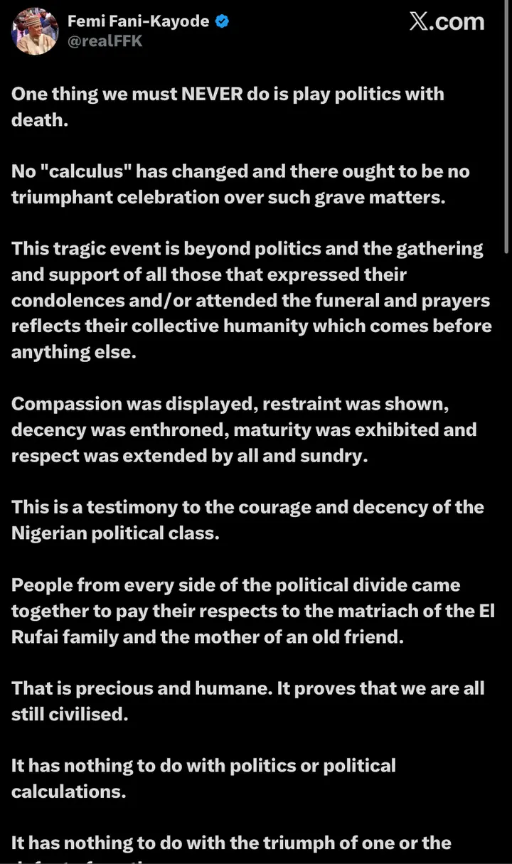 Fani-Kayode praised the conduct of the political class during the mourning period, noting that the presence of individuals from across the political divide served as a testimony to national maturity. He argued that the event should be viewed as a civilised response to a personal tragedy involving the “mother of an old friend,” rather than a political summit.