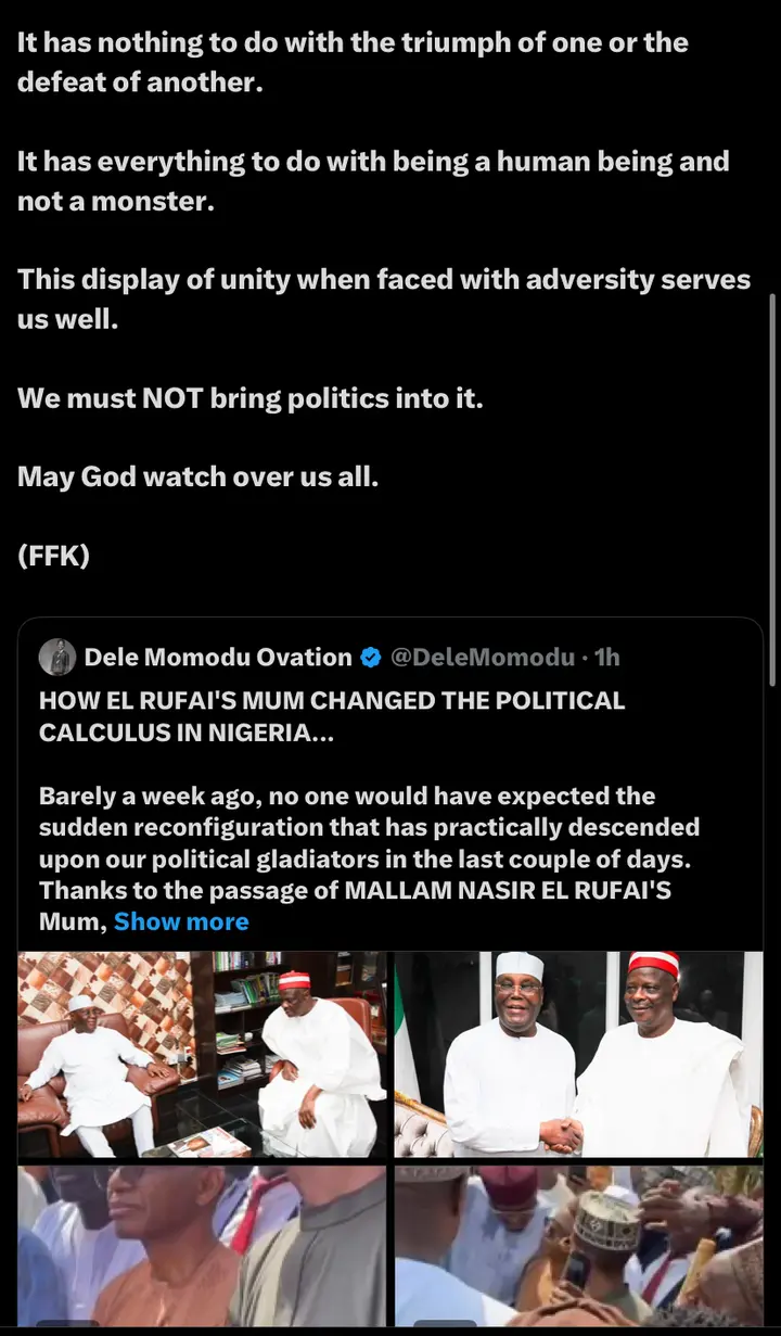 The reaction comes in direct response to assertions made by veteran journalist Dele Momodu, who suggested that the passage of El-Rufai’s mother had forced a “sudden reconfiguration” of political gladiators. Fani-Kayode dismissed these notions, insisting that the cross-party attendance at the funeral was a display of shared humanity rather than a strategic realignment.