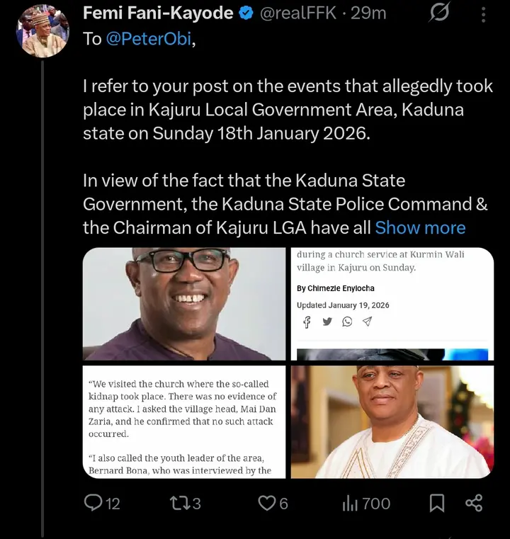 Chief Femi Fani-Kayode has strongly criticised Peter Obi over his response to recent reports of a mass abduction in Kajuru Local Government Area of Kaduna State.