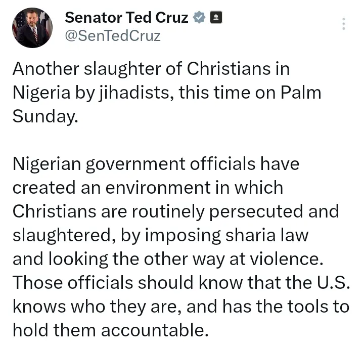 One of the lawmakers in the United State of America, Senator Ted Cruz has accused the government of Nigeria of persecuting Christians.