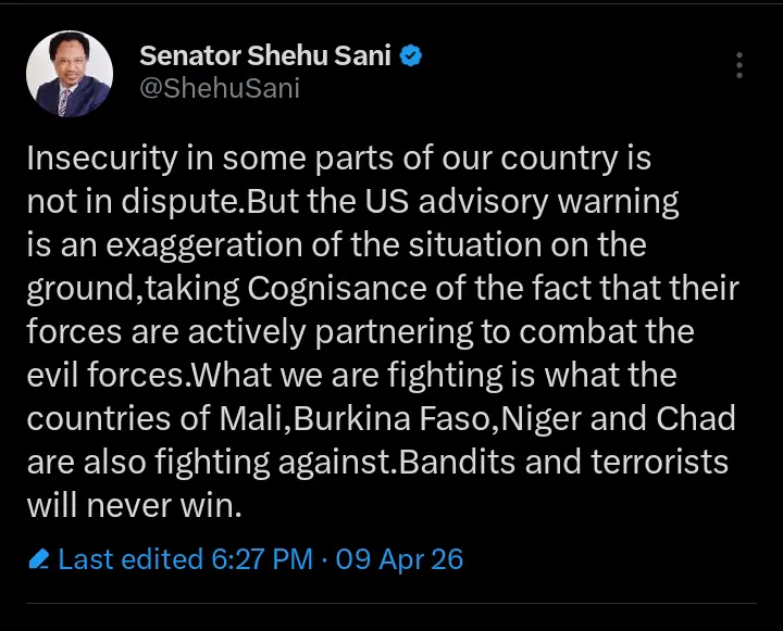 In his post, Sani suggested that a recent advisory issued by the United States presents an exaggerated picture of the security situation, according to him, such warnings may overlook the ongoing efforts being made by Nigerian authorities and their international partners and stated that security forces are actively working to address threats and restore stability in affected areas.