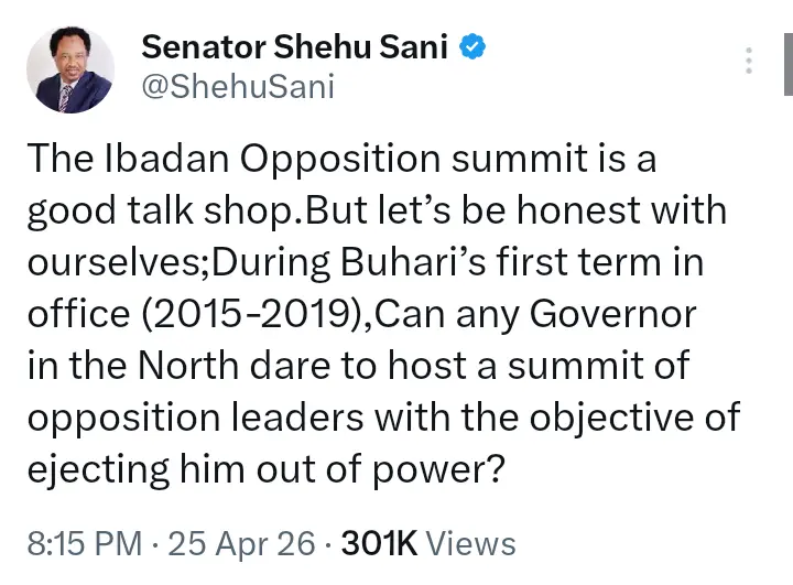 The reaction of Senator Shehu Sani was contained in a post that he shared on his official X handle on April 25, 2026.
