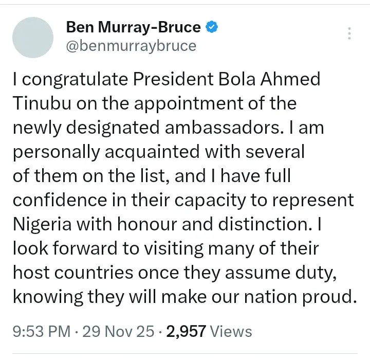 Murray-Bruce expressed his views in a message posted on his official X handle following the announcement. President Tinubu had earlier forwarded a list of 32 nominees to the Senate for screening and confirmation. The nominees are made up of 17 non-career diplomats and 15 career officers, who are expected to represent Nigeria in key international institutions and countries.
