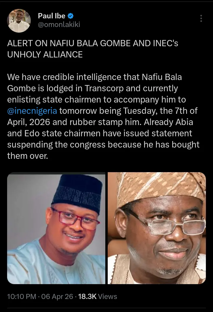 Paul Ibe, the senior special adviser on media to African Democratic Congress, ADC Chieftain and Elderstateman Atiku Abubakar has raised serious concerns over the actions of Nafiu Bala Gombe amid the recent crisis rocking the ADC. According to the statements which were shared on his official X handle, he pointed out that Abia and Edo State chairmen had already been bought over by him.