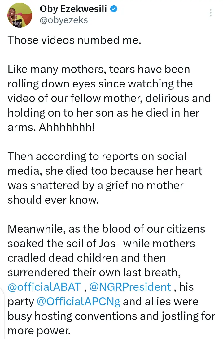 The former Minister of Education, Oby Ezekwesili has reacted after terrorists attacked a community in Plateau state and killed several residents.