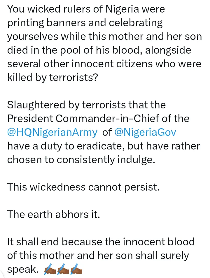 “You wicked rulers of Nigeria were printing banners and celebrating yourselves while this mother and her son died”. Read_More…