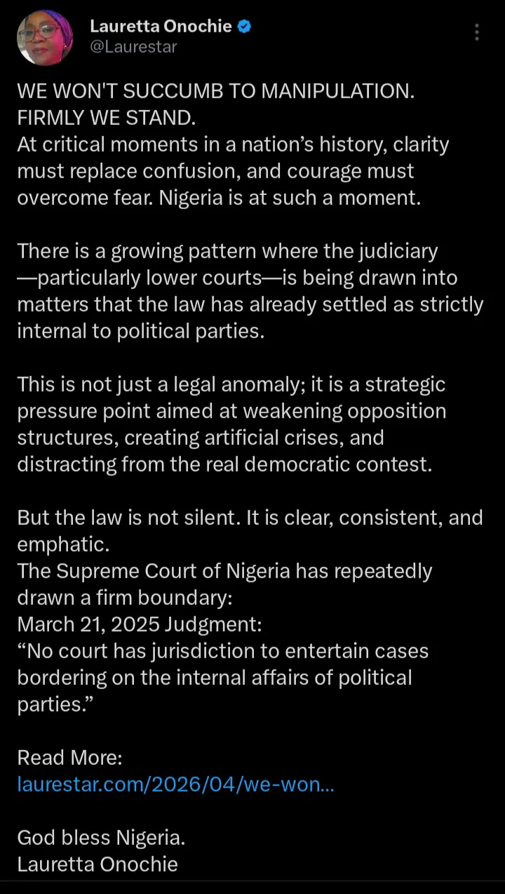 Kindly read what Lauretta Onochie wrote on her official X handle below;