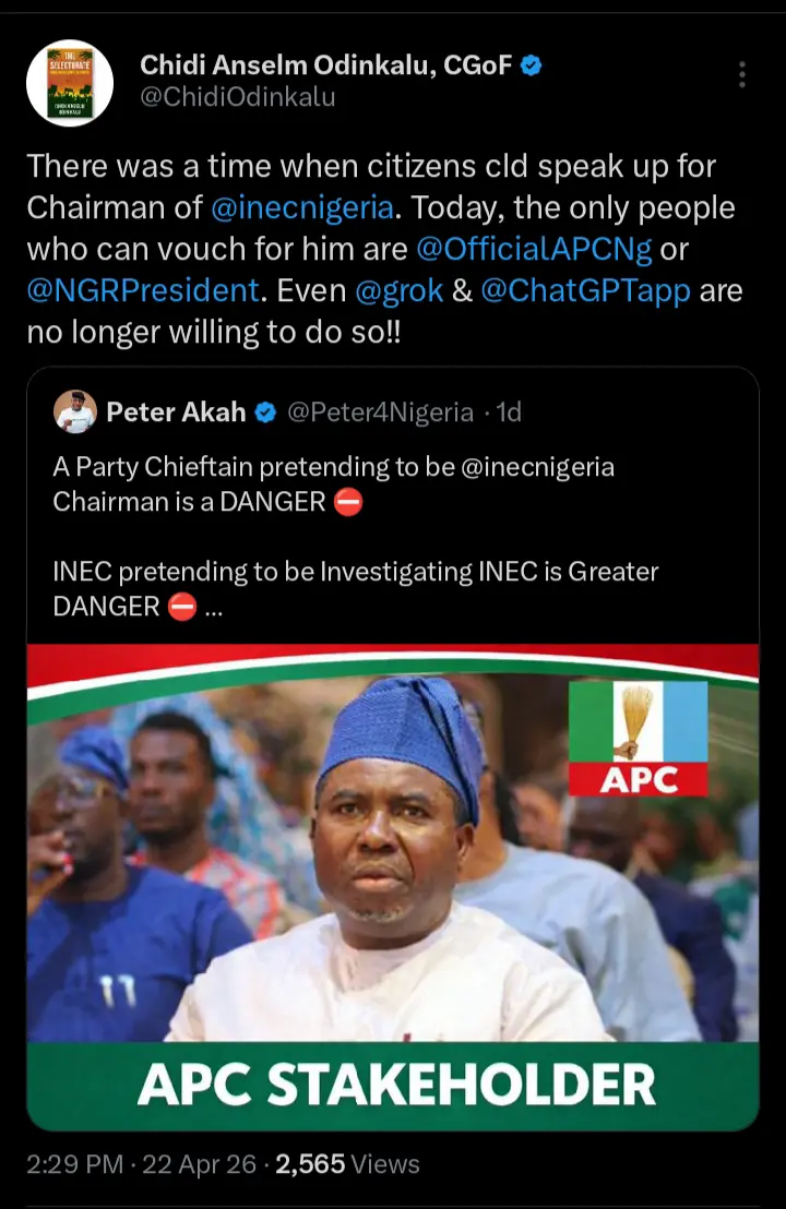 “There was a time when citizens could speak up for Chairman of INEC. Today, the only people who can vouch for him are APC….” He wrote. Read_More…