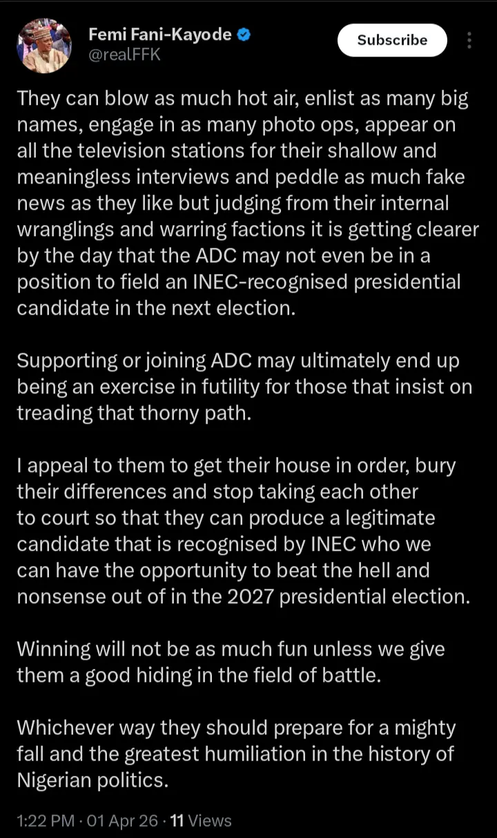 Femi Fani-Kayode, Nigeria’s ambassador designate to Germany and former minister for aviation has taken to his official X handle to send a strong message to the African Democratic Congress, ADC. According to the statements which were shared on his official X handle, he pointed out that the ADC might not field a presidential candidate in 2027.