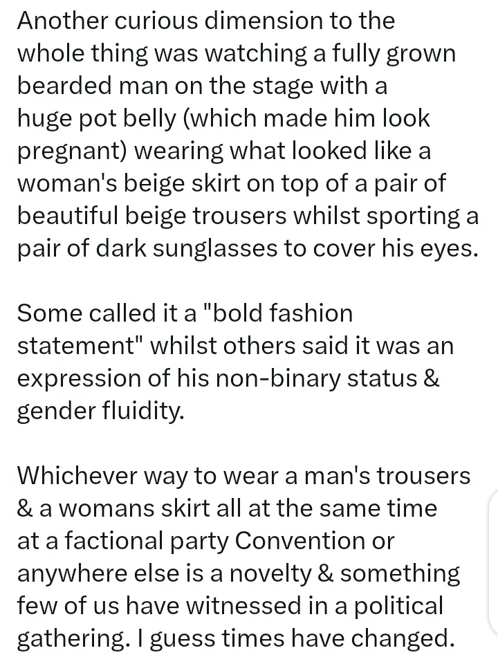 “Whichever way, to wear a man’s trousers and a woman’s skirt all at the same time at a factional party convention or anywhere else is a novelty and something few of us have witnessed in a political gathering”. Read_More…