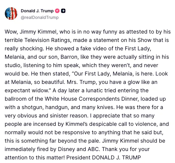 As of the time of filing this report, neither Jimmy Kimmel nor ABC has issued an official response to the president’s demand.