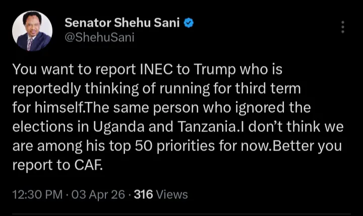 Former Kaduna central senatorial district lawmaker and renowned human rights activist, Senator Shehu Sani has taken to his official X handle to send a strong warning across following the heated arguments that trailed the recent de-recognition of the African Democratic Congress, ADC. According to the statements which were shared on his official X handle, he pointed out that president Donald Trump should not be involved.