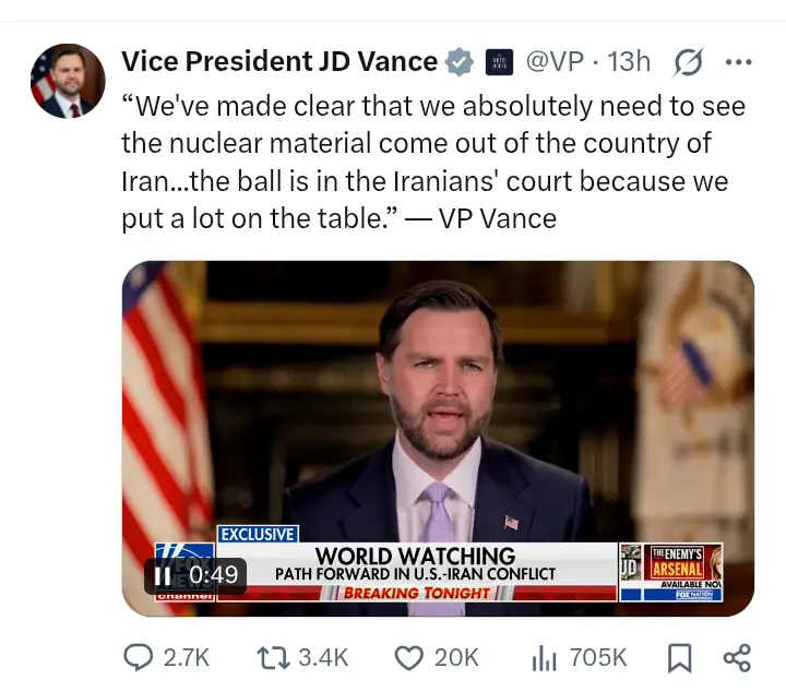 In a statement posted on his verified social media account, Vance emphasized that the United States had made significant concessions during the talks but is now waiting on Iran to respond. “We’ve made clear that we absolutely need to see the nuclear material come out of the country of Iran… the ball is in the Iranians’ court because we put a lot on the table,” he said.