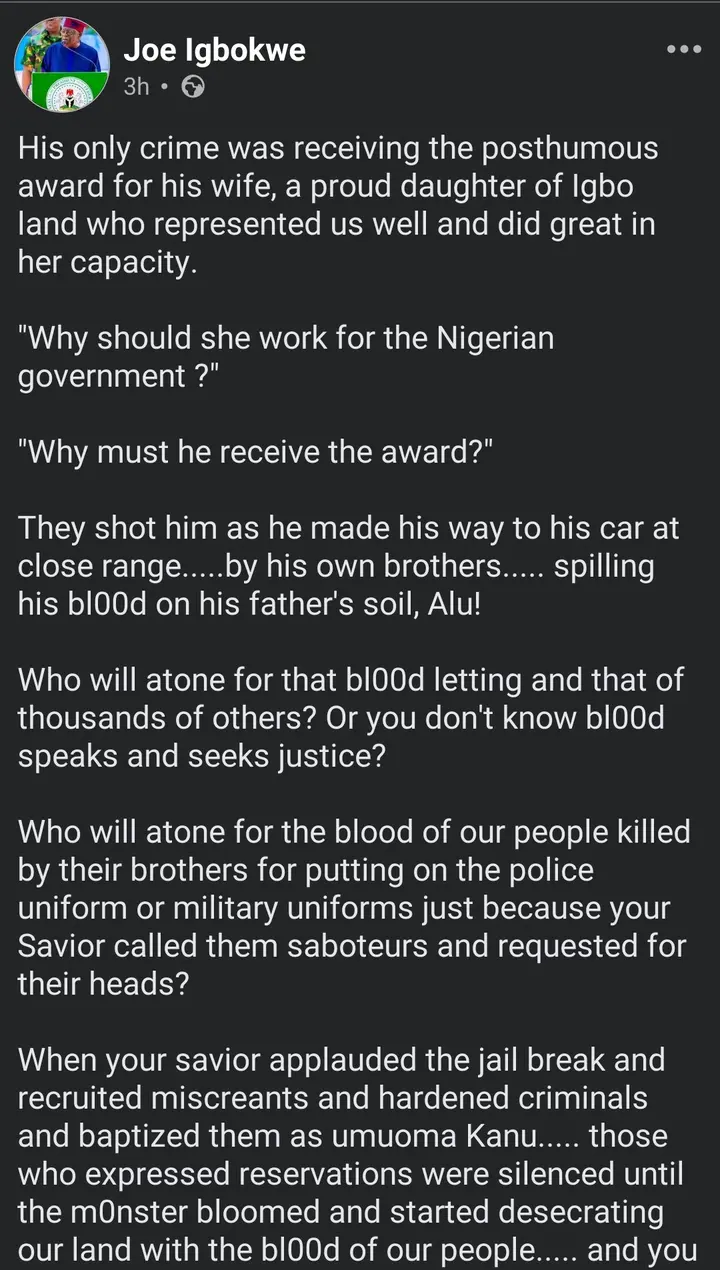 Igbokwe argued that his critics have refused to engage with the issues he raised and instead resorted to personal insults. He maintained that his call for accountability over violence in the Southeast should not be interpreted as hostility toward his ethnic group, but as a plea for introspection in the aftermath of years of unrest linked to separatist activities.