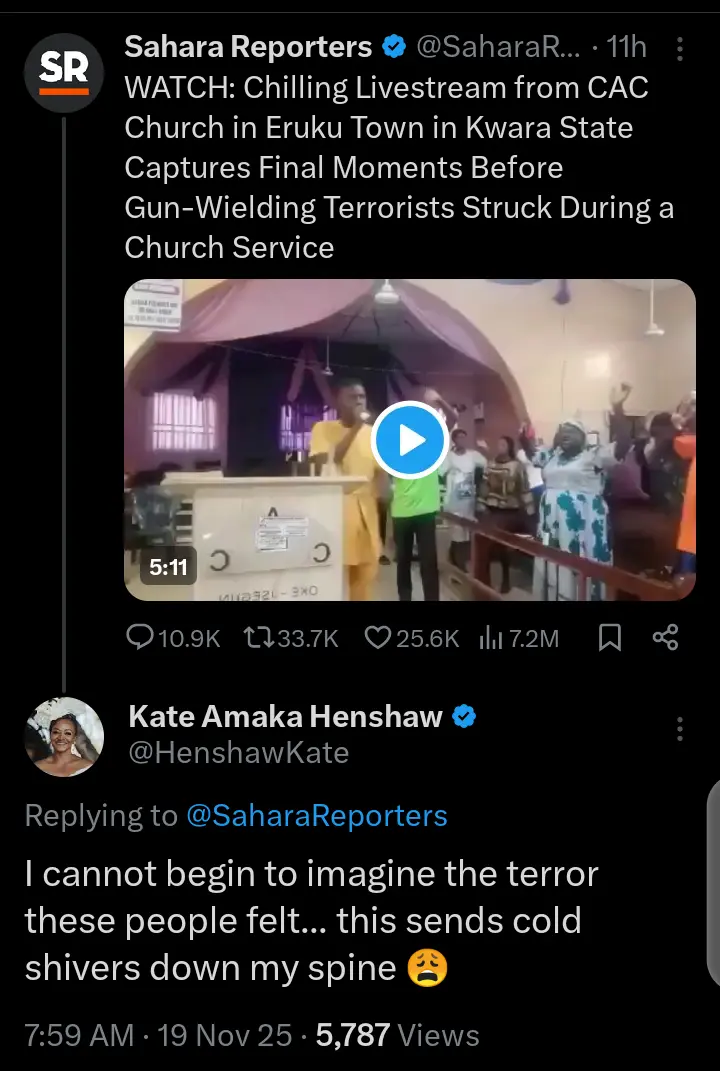 Nigerian popular Nollywood actress, Kate Amaka Henshaw has taken to her official X account on Wednesday, November 19, 2025 to react to a video which captured the moment some terrorists stormed the Christ Apostolic Church, CAC, in the Eruku area of Kwara state.
