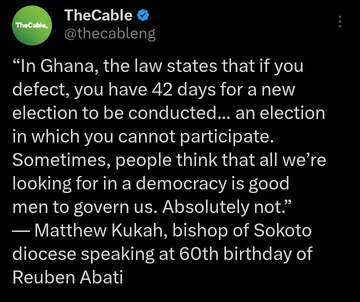 In the post that surfaced online, Kukah stated that in Ghana, whenever a person defects, the law permits the conduct of a new election after 42 days. He said the election will be conducted and the person who defected won’t be eligible to participate.
