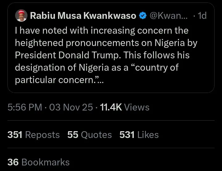 Kwankwaso had earlier advised that Washington’s approach should focus on providing intelligence and high-tech support to Nigerian security agencies. He cautioned that any aggressive foreign interference could worsen Nigeria’s internal tensions and fuel more religious divisions. In his words, “The United States of America should assist the Nigerian authorities with better cutting-edge technology to tackle these problems, rather than posing a threat that could further polarise our country.”