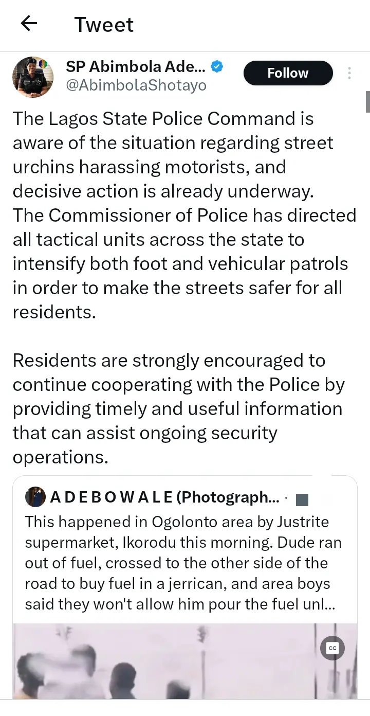 This tweet from the man has attracted reactions, one of which was from the Lagos State Police Command Public Relations Officer PRO, SP Abimbola Adebisi, who tweeted: “The Lagos State Police Command is aware of the situation regarding street urchins harassing motorist, and decisive action is already underway…”