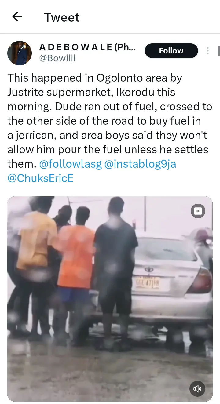 Sharing video of the young men allegedly demanding for money from a motorist inorder to be allowed to pour fuel into his car, a Twitter user wrote: “This happened in Ogolonto area by Justrite supermarket, Ikorodu this morning…”