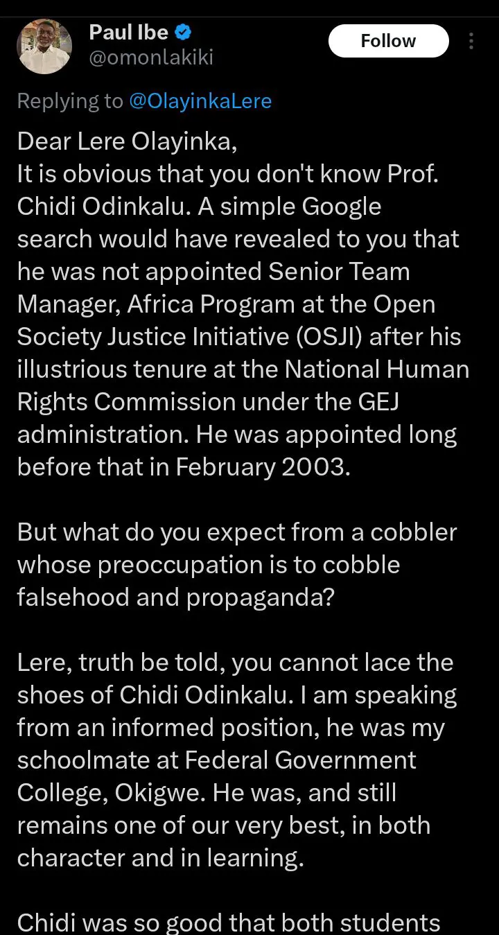 The debate began with Lere Olayinka’s post accusing Odinkalu of promoting LGBTQ rights and undermining former President Goodluck Jonathan, linking him to the Open Society Justice Initiative.