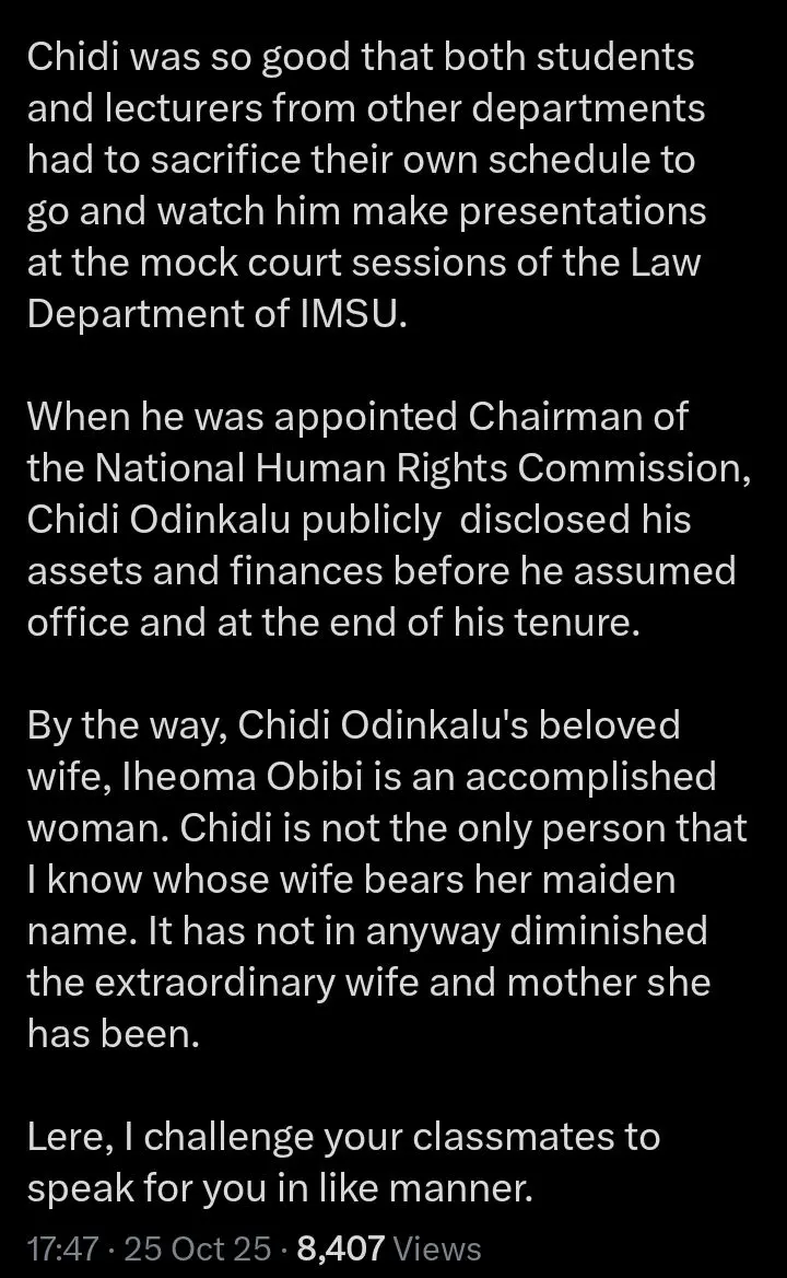 Ibe, who claims to be Odinkalu’s schoolmate from Federal Government College (FGC) Okigwe, defended his character, citing their shared academic history and Odinkalu’s ethical record, including public asset disclosures.