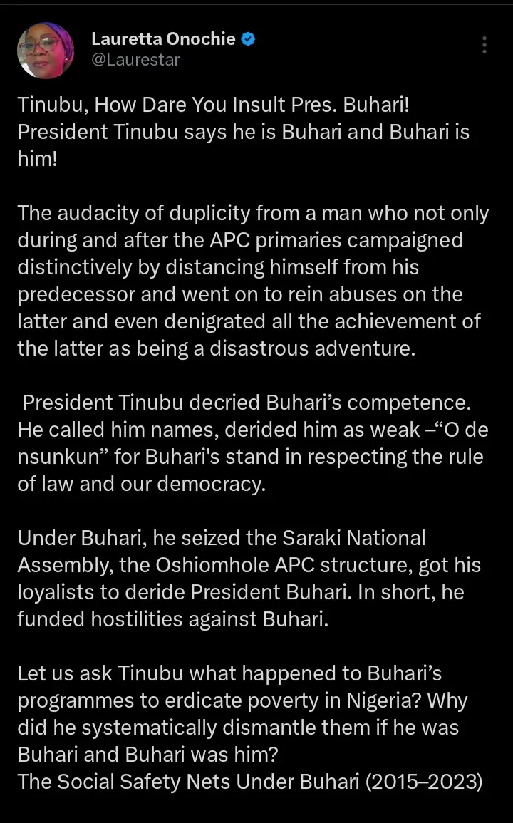 Kindly read what Lauretta Onochie wrote on her official X handle below;